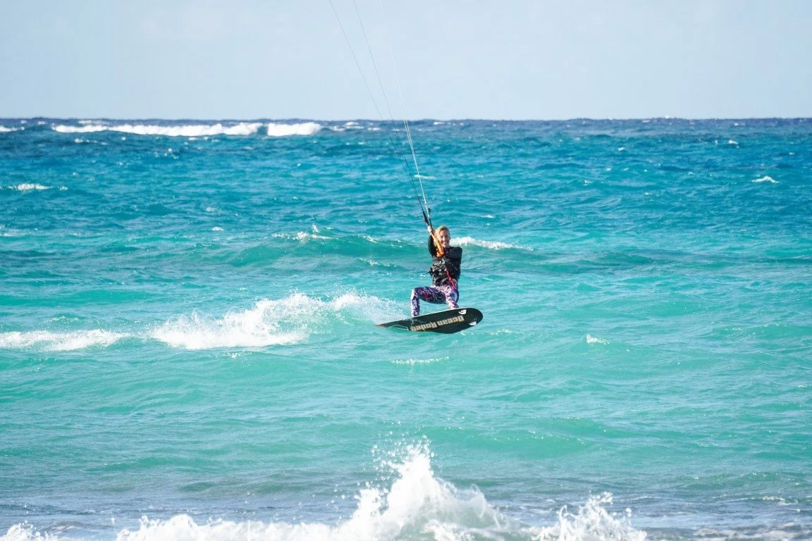 Most people use “kiteboarding” and “kitesurfing” interchangeably, but I distinguish the two because they’re genuinely different styles. I’m a kiteboarder—I ride a twin-tip, which is perfect for flat-water cruising and jumping. Mark is a kitesurfer—he rides a strapless surfboard and heads out to the reef to surf waves. Don’t worry, we still love each other.